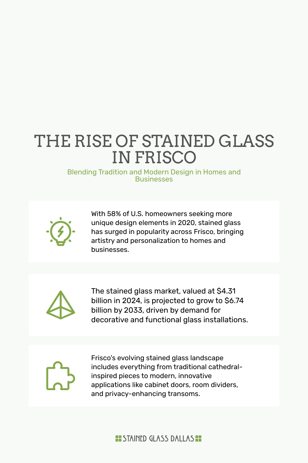 In Frisco, the demand for stained glass reflects broader national and global trends but with a local twist. The city’s cultural and architectural landscape accommodates a variety of styles—from classic designs that echo Gothic and Art Nouveau influences to contemporary patterns that mirror the region’s modern collecting ethos.